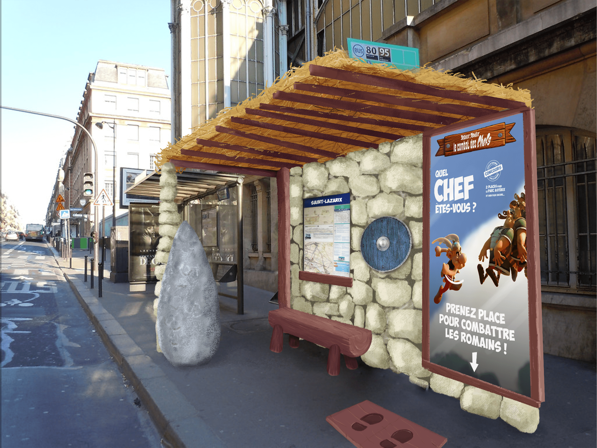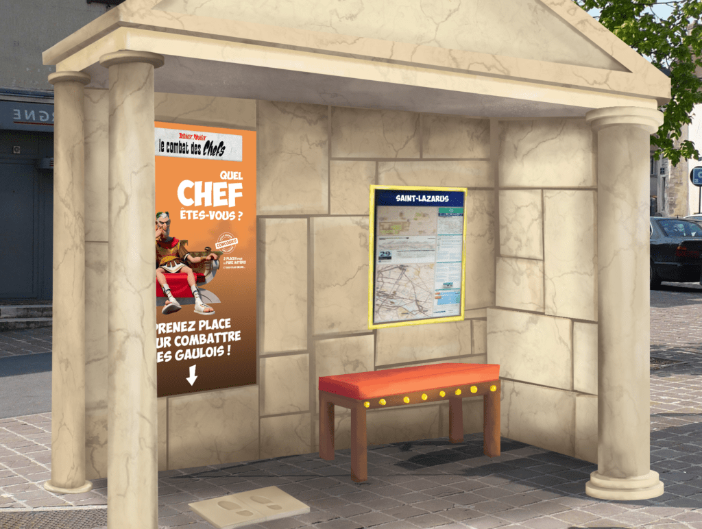 Création de croquis et designs réalistes pour des abribus thématisés, plongeant le public dans l’univers de la série. Deux abribus face-à-face incarnent les camps romain et gaulois, avec décors détaillés et noms de stations revisités. Les passants peuvent interagir, choisir leur camp et défier l’abribus opposé, transformant la rue en véritable expérience immersive et ludique.